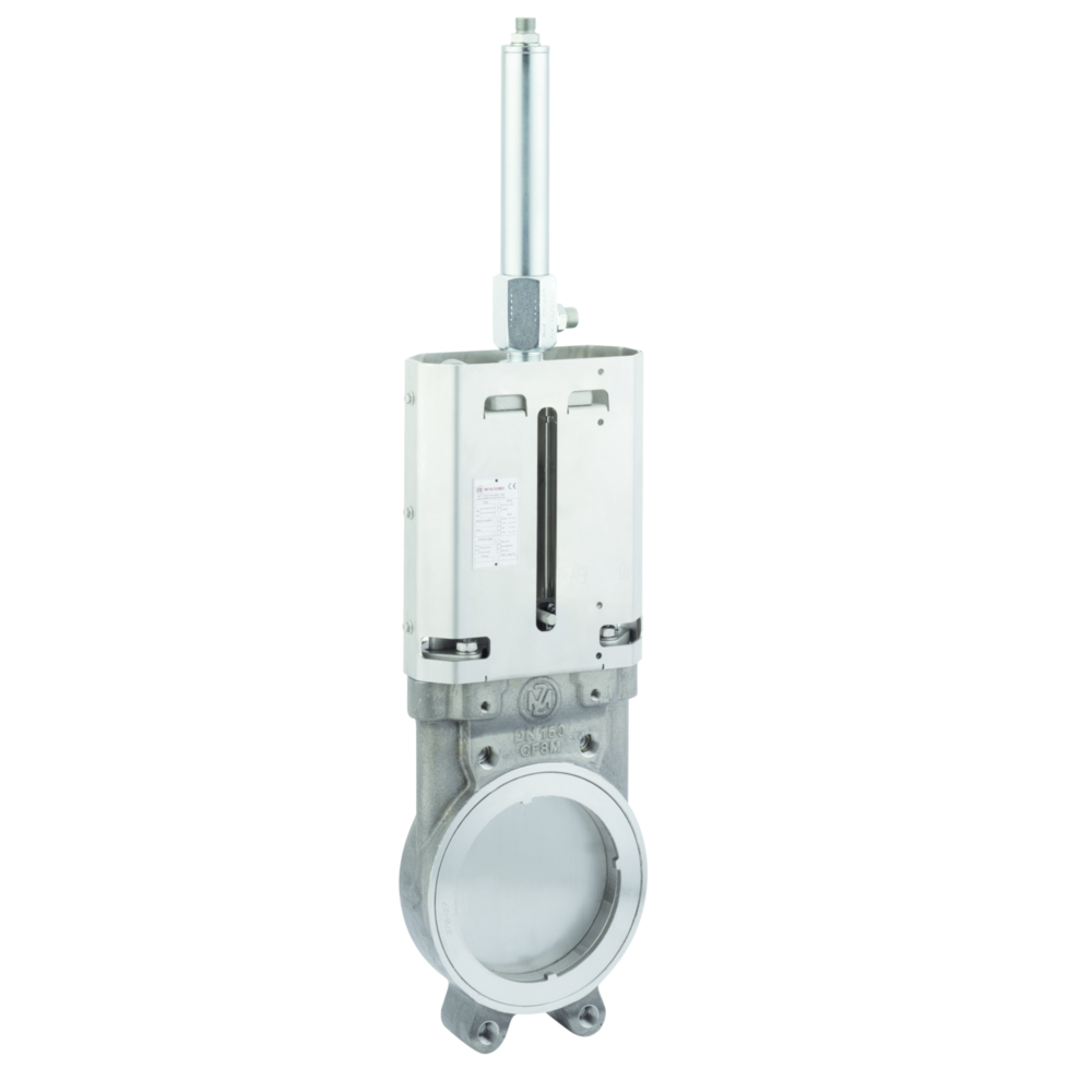 Edelstahl Plattenschieber mit doppelwirkendem Hydraulikzylinder